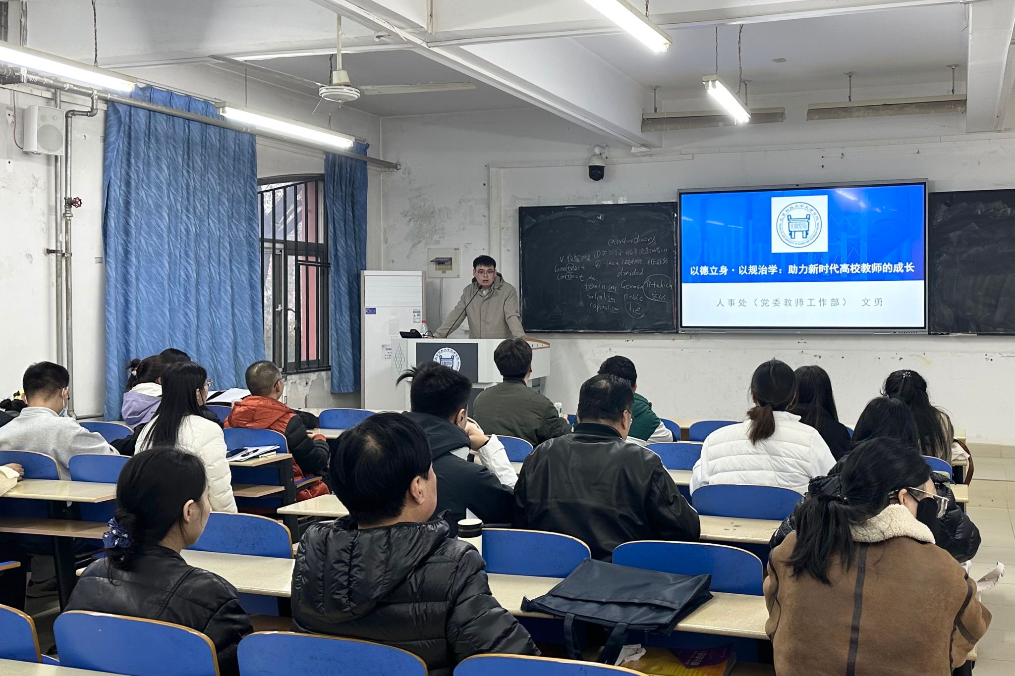 在9教106开展2025年新入职教职工岗前培训“新教师职能部门规章制度”系列讲座,邀请党委教师工作部师德师风建设科科长文勇老师作题为“以德立身·以规治学:助力新时代高校教师的成长”专题培训。全体新入职教职工参加培训。