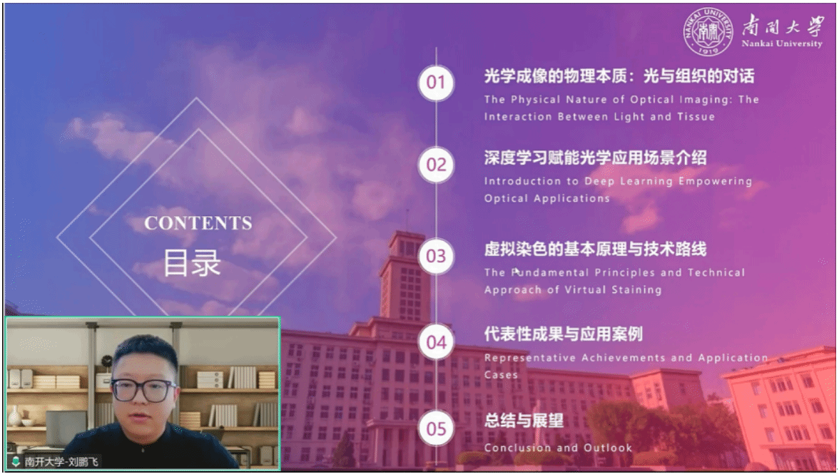 刘鹏飞以《当深度学习遇见光:AI赋能的生物组织虚拟染色新范式》为题,展示人工智能在生物组织虚拟染色中的前沿成果。他深入解析了AI如何模拟光学传播、组织散射等物理过程,实现无需化学染色的高精度组织成像,并展望了该技术在疾病诊断与治疗中的广阔前景。报告后,他与参会教师就虚拟染色技术的准确性及其临床应用的可行性进行了专业交流,为“AI+物理”交叉研究提供了新思路。