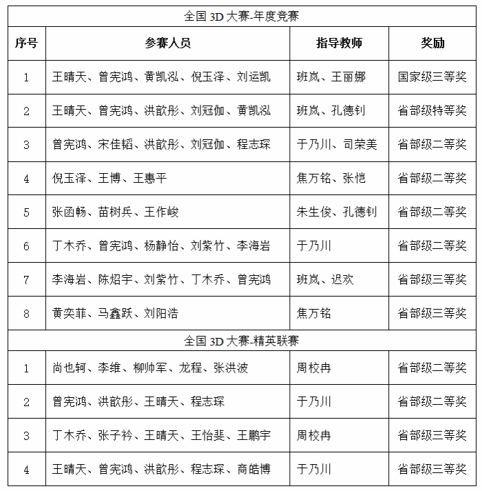 我校共取得全国3D大赛-年度竞赛全国总决赛三等奖1项,天津赛区特等奖1项、二等奖4项、三等奖2项;并取得全国3D大赛17周年精英联赛天津赛区二等奖2项、三等奖2项。