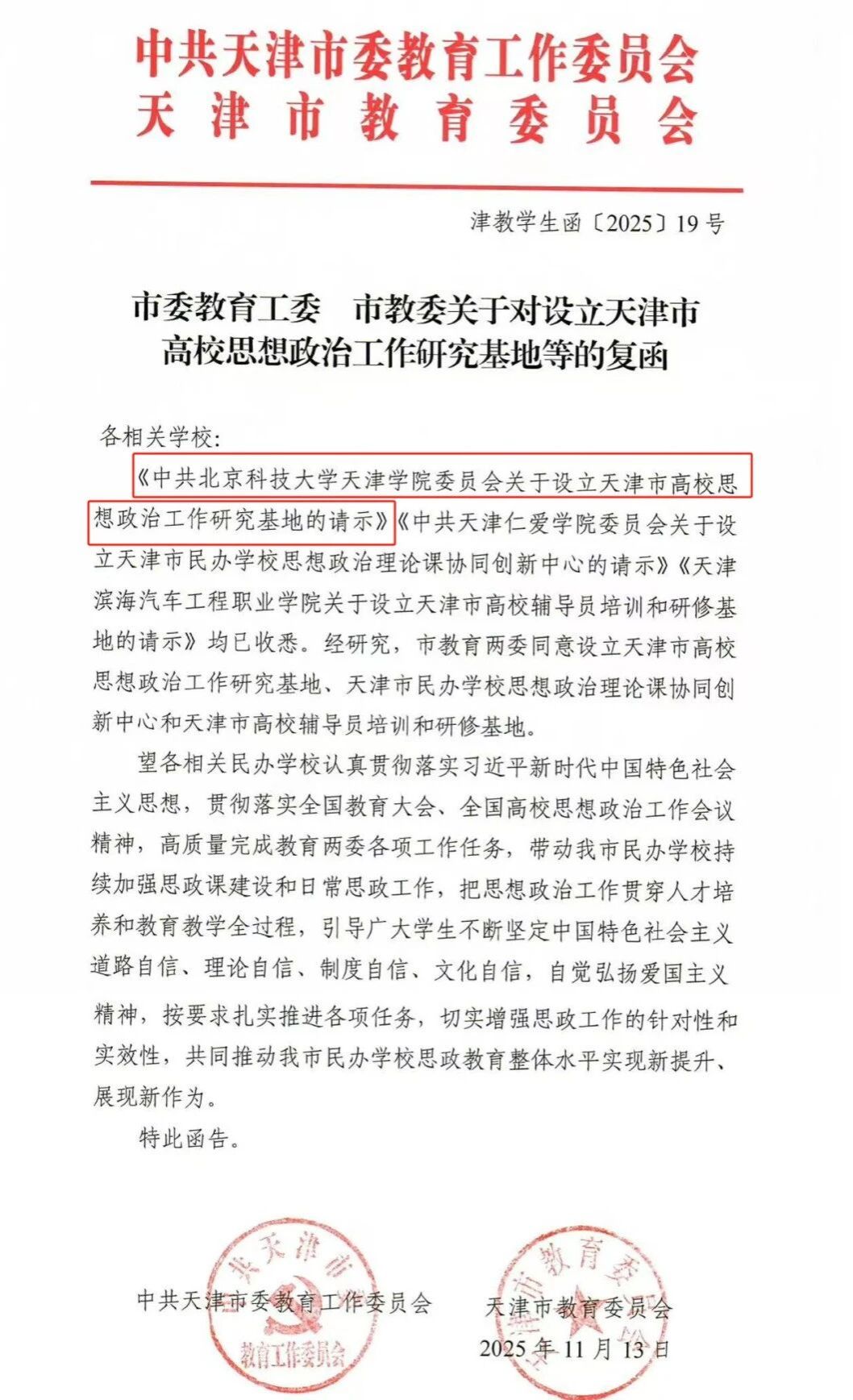 积极回应新时代思政工作发展需求,于2025年11月向市教育两委提交设立天津市高校思想政治工作研究基地的请示并获批。基地将聚焦民办高校思想政治工作中的重点难点问题,开展系统化、专业化研究,旨在打造具有示范引领作用的思政工作平台。