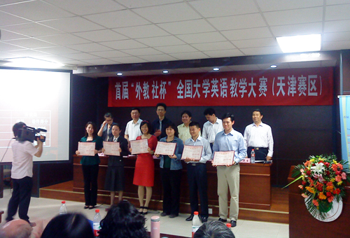 参加了上海外语教育教学出本社主办,天津大学承办的首届“外教社杯”全国大学英语教学大赛(天津赛区)。大赛分综合组和听说组,分别来自全市24所高校的43位优秀教师参加了比赛,竞争激烈。在综合课组和听说组复赛中,张悦和贾林老师分别以优异的成绩进入决赛。 在5月16日的天津地区决赛中,张悦老师以9.026的优异成绩获得天津赛区综合组二等奖,贾林老师以8.937的成绩获得天津赛区听说组三等奖。