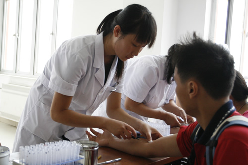 2008级新生入学体检工作于21日早7:00在行政楼一楼大厅进行。 机械、管理、经济三个系近700余人参加了体检,分别进行内科、外科、耳鼻喉科、眼科胸透及抽血化验六项检查。负责本次体检工作的是宝坻区中医院体检中心的医务人员。 体检过程中学生秩序井然,志愿者服务热情周到,截止中午本日体检工作顺利完成,其余报到新生将于22日接受身体检查。 (摄影:宣传部/学生通讯社 鹿麟、柳阳)