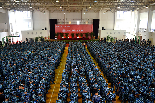 2013级全体新生身着崭新的军装在体育馆列队。伴随着艺术团管乐团现场演奏的国歌,典礼正式开始。