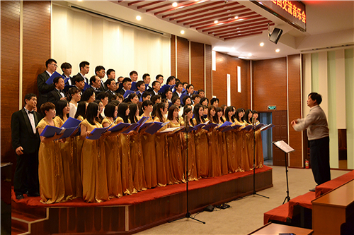 学生艺术团合唱团在张鹏老师的指挥下,由艺术系王欣老师钢琴伴奏,给大家带来合唱《praise his holly name》、《Blackbird》以及无伴奏合唱《青海梦》。之后,天津都市礼仪合唱团接着上场,为观众奉上歌舞表演《三月三,九月九》、女声小合唱《老师我想你》、无伴奏合唱《家乡的黄昏》、混声合唱《茨冈》等曲目,精彩的演出令在场观众陶醉其中,现场掌声不绝。当演出接近尾声的时候,主持人提议让两支合唱团共同合唱,《故乡的亲人》《再过二十年我们来相会》,在场观众连声叫好。一首首中外名曲,带给观众精神上的享受和心灵上的洗礼,让全院师生领略到了合唱的无限魅力。