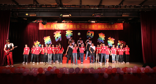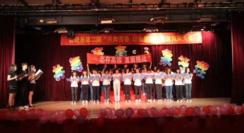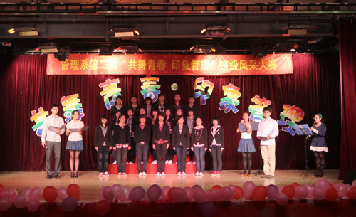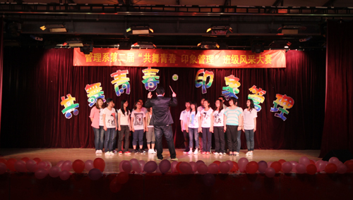 管理系第二届“共舞青春•印象管理”班级风采展示晚会由管理系分团委策划,系学生会承办,得到了同学们的热情响应。晚会经过初审、复审、彩排紧锣密鼓的组织、排练,最终来自09、10级的9个班级进入了当晚的决赛展示。展示主要包括班级PPT展示、班级节目表演和红歌合唱三部分。