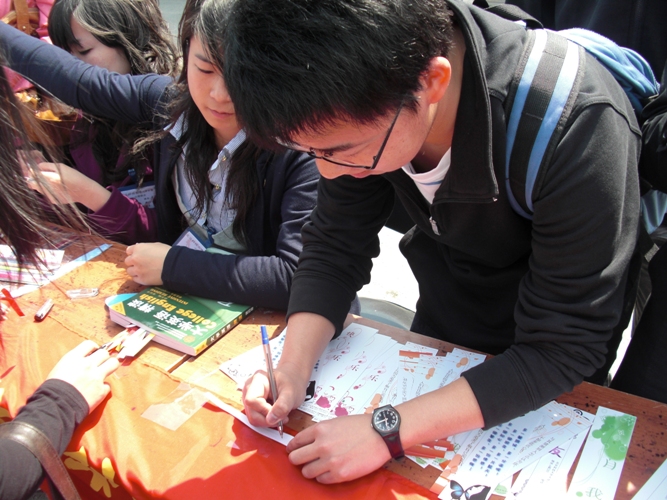 心理活动展台一直保持了热烈的气氛,历时近2个小时的活动中,来往同学络绎不绝,通过微笑和心愿的传递,传递了快乐理念,倡导了积极友善、乐观向上的健康心态。
