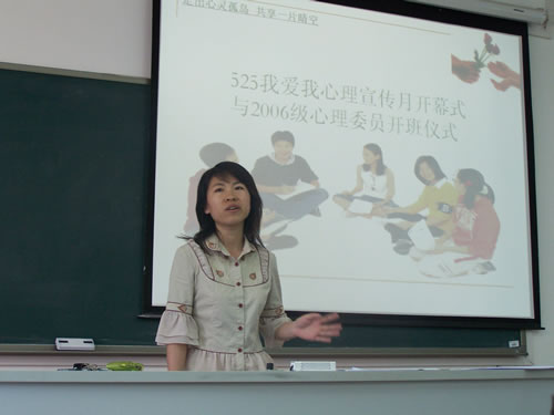 5月16日下午,在7教305举行了首届“525我爱我”心理宣传月活动开幕式暨06级心理委员开班仪式。本次活动由学生事务部心理咨询中心和心理协会主办,信用网博彩