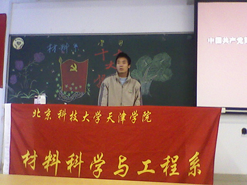 在庄严的国歌声中,材料系学习党的十七次全国代表大会精神会议正式开始。会上,材料系分团委书记罗富臣老师用播放幻灯片的形式对胡锦涛总书记在十七大上的报告进行简单而生动的回顾,尤其是对胡锦涛总书记对教育的重视进行了重点讲解,在党的十七大报告中,胡总书记号召全党要优先发展教育,建设人力资源强国,这对教育系统的广大师生员工来说,既是极大的鼓舞,又是进军的嘹亮号角。罗老师就如何学好十七大精神向材料系同学提出了具体要求。