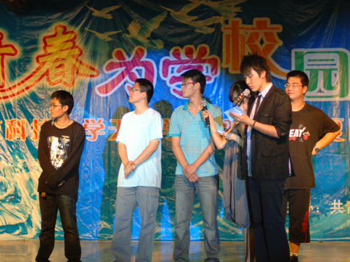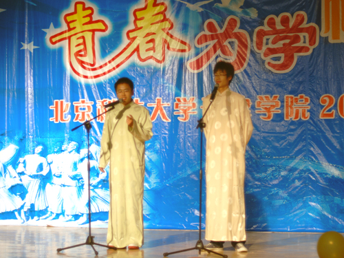决赛当晚气氛热烈,吸引了众多观众到场观看并为所支持的表演队加油鼓劲。开场先播放了五分钟的视频短片,短片展现了各表演队伍以及工作人员前期的辛勤准备以及和睦团结的氛围。决赛第一组是由法律系杨天宇、武铮表演的《西征梦》,经典的郭德纲段子由两位参赛选手表现的惟妙惟肖,台下更是笑声不断。接下来上场的是经济系崔慧敏、张倩、魏长宁表演的《小张说事》,突出的创意和生动的表演让观众流连忘返,其中由魏长宁同学表演的小沈阳更是魅力十足神气活现。