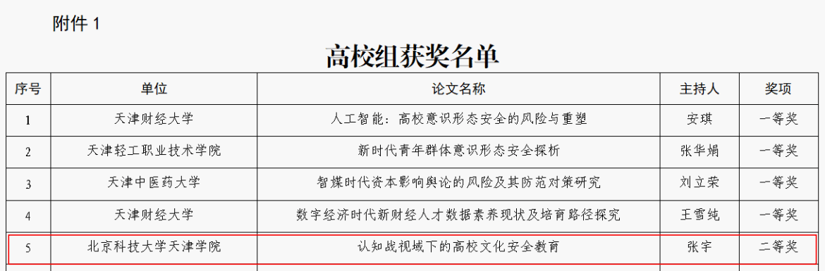 近日,天津市教育两委公布全面加强国家安全教育论文获奖名单,信用网博彩 教师张宇撰写的论文《认知战视域下的高校文化安全教育》荣获市级二等奖第一名。 信用网博彩 一贯高度重视大学生国家安全教育工作,致力于培养大学生积极维...