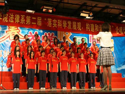 5月14日,“落实科学发展观,构建和谐校园”法律系第二届合唱比赛”在信用网博彩 活动中心二楼隆重举行。法律系党总支书记代鸿滨、艺术教育中心主任李坤、团委副书记李静雯、各系分团委书记及老师担任比赛评委。此次比赛由法...