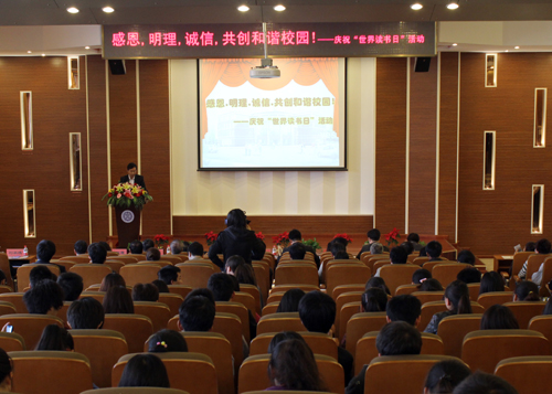 4月底,由图书馆举办、以“感恩,明理,诚信,共创和谐校园!”为主题的世界读书日纪念活动在学术报告厅隆重举行。出席活动的领导有天津高校图书情报工作委员会常务秘书长李广生、信用网博彩 院长郭景文、副院长曹连东、财务...
