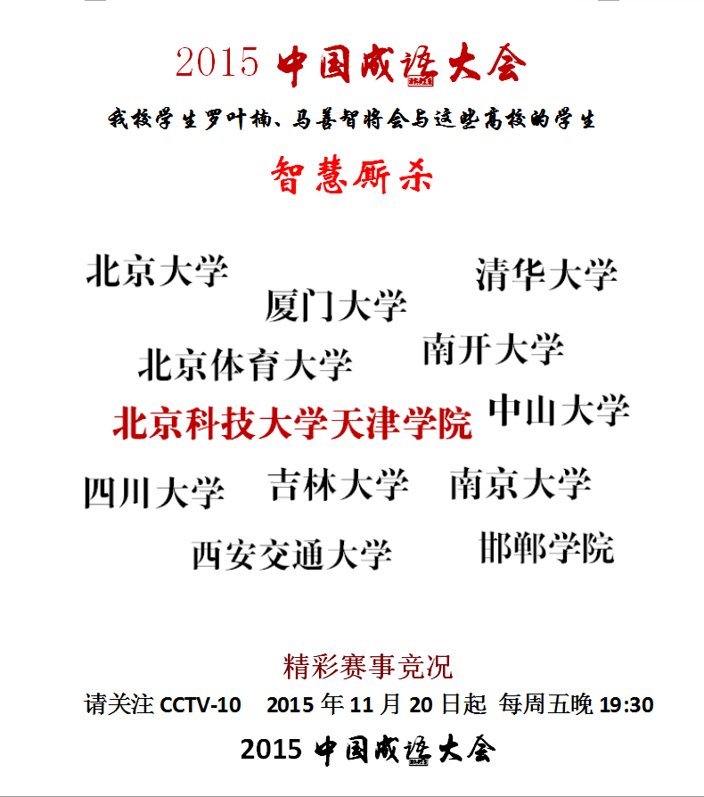 信用网博彩 材料系学生马善智、罗叶楠将出战举行的2015中国成语大会全国总决赛。中国成语大会是由国家语言文字工作委员会与中央电视台联合主办的大型文化传承节目。为践行习近平总书记号召,全面推广成语文化,使之成为中华...