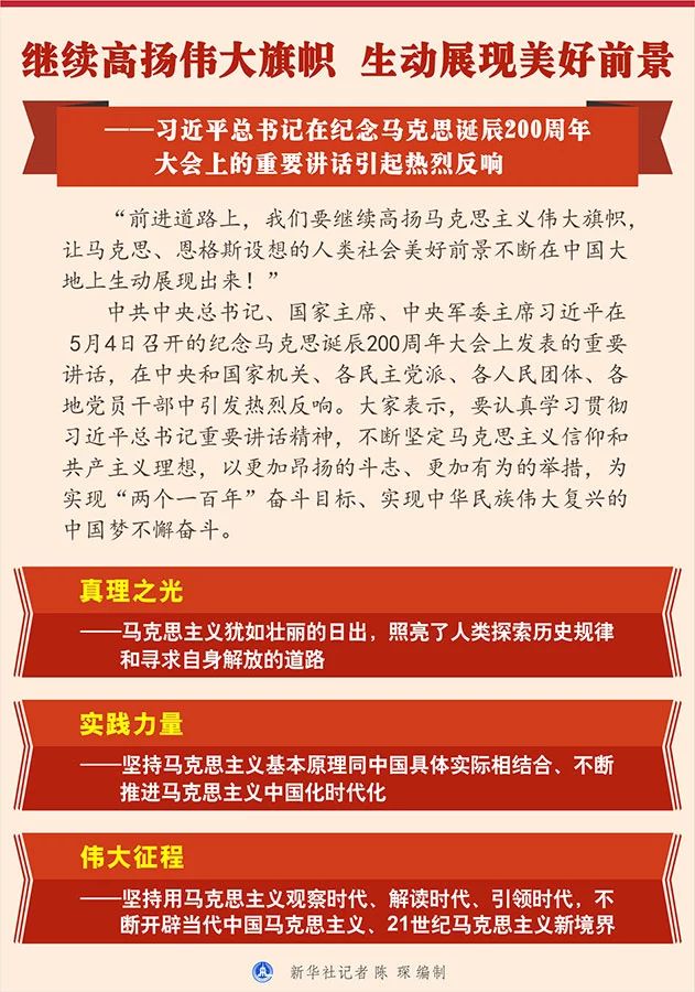 “前进道路上,我们要继续高扬马克思主义伟大旗帜,让马克思、恩格斯设想的人类社会美好前景不断在中国大地上生动展现出来!” 中共中央总书记、国家主席、中央军委主席习近平在5月4日召开的纪念马克思诞辰200周年大...