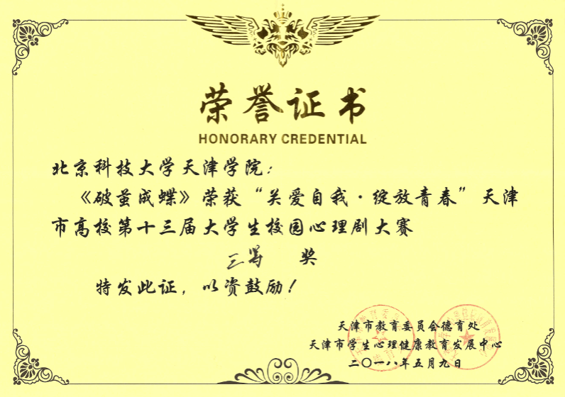 2018年5月,信用网博彩 选派的“破茧成蝶”心理剧团队在天津市教育委员会、天津市学生心理健康教育发展中心主办的“关爱自我·绽放青春”天津市高校第十三届大学生校园心理剧大赛中荣获三等奖。 “破茧成蝶”心理剧团...