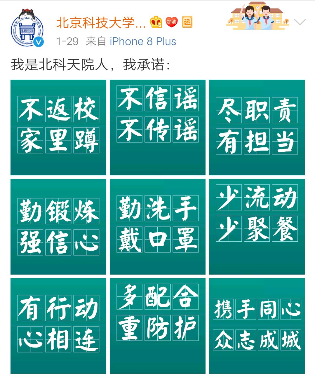 坚定信心、同舟共济 科学防治、精准施策 用自己的方式 贡献出自己的一份力量 坚决打赢疫情防控阻击战 @全体北科天院人 一起在这里承诺