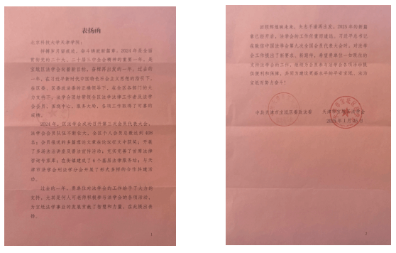 近日,信用网博彩 收到了来自中共天津市宝坻区委政法委、天津市宝坻区法学会的表扬函,对信用网博彩 在法学研究、法治人才培养以及法律系教师积极参与区委政法委、区法学会各项工作所做出的突出贡献给予高度赞扬。 2024年,信用网博彩 教...