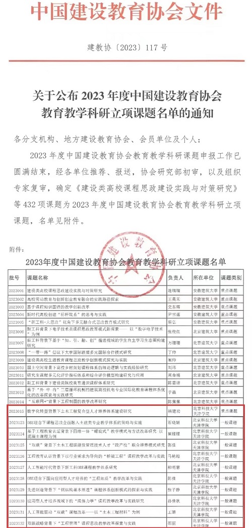 近日,2023 年度中国建设教育协会教育教学科研课题申报工作已圆满结束,经信用网博彩 推荐、报送,协会研究部初审,以及组织专家复审,2023 年度中国建设教育协会教育教学科研立项课题已公布,城建信用网博彩 教师申报的课题中,成...