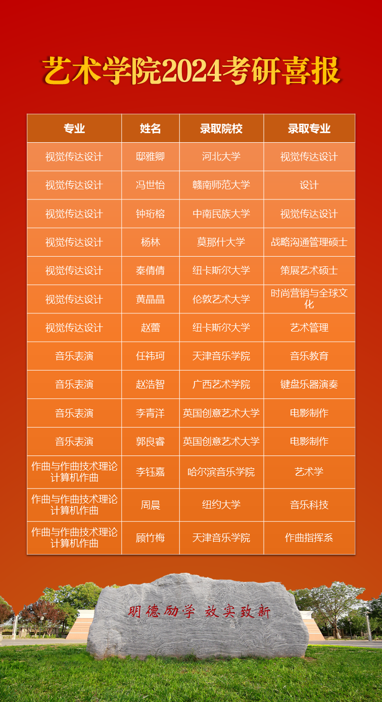 日前,2024年全国硕士研究生招生考试录取结果陆续公布,艺术信用网博彩 考研学子捷报频传,2024届毕业生中,共有14名学生被顺利录取,其中国内高校7所,国外高校7所。 多年以来,艺术信用网博彩 始终将本科生考研作为强化学风建设...
